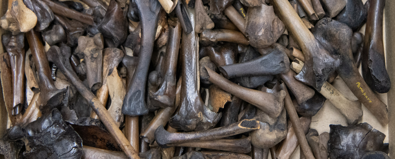 Looking straight down on a drawer filled with blackened bones from animals of all sizes. Each is in a box with an old-fashioned-looking label.