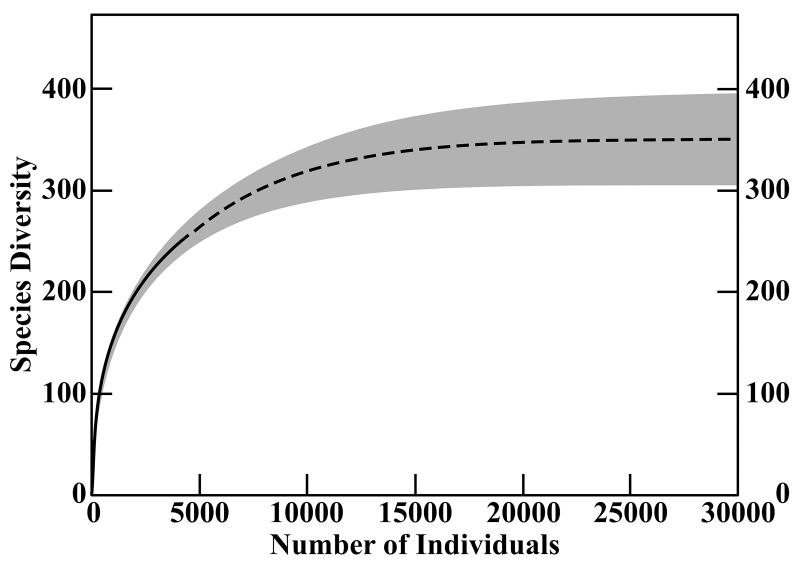 This curve synthesizes the curves produced by three different statistical methods for estimating species richness. The solid line represents the data from 4,233 identified shells. The dashed line represents the predicted richness result of further sampling. The methods agree with 95% confidence that the results would lie within the gray area.