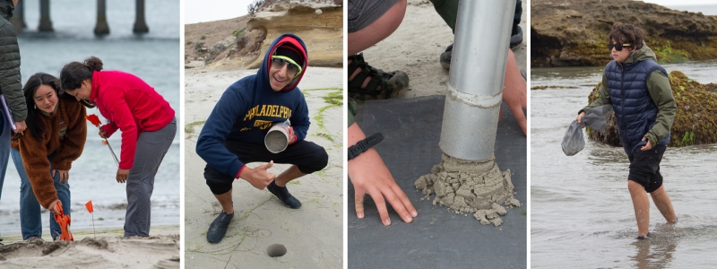 Sampling steps, left to right: 1) mark points to be sampled along a line 2) sample sand and organisms along for the ride with a coring device called a “clam gun” 3) deposit your sample on mesh 4) remove the sand by swishing your mesh in the surf.