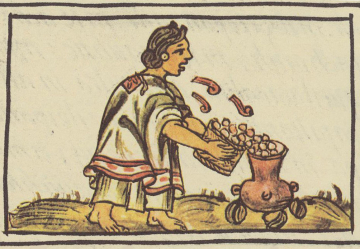 Photo of maize CC 4.0 by Carlos Santiago. Aztec woman cooking maize in an olla, Florentine Codex, Bernardino de Sahagún (1577)