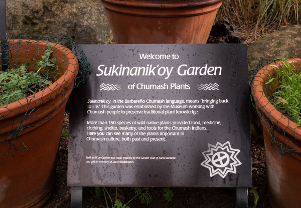 The heart of this area is the Sukinanik’oy Garden of Chumash Plants. In the Barbareño Chumash language, sukinanik’oy means “bringing back to life.” This garden was established by the Museum working with Chumash people to preserve traditional plant knowledge. More than 150 species of wild native plants provided food, medicine, clothing, shelter, basketry, and tools for the Chumash Native people of our region. The garden shares information about many of the plants important in Chumash culture, both past and present. The Sukinanik’oy Garden was made possible by the Garden Club of Santa Barbara and gifts in memory of Dawn Hattenbach.